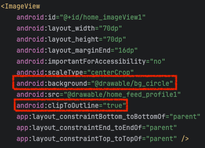 이렇게 background옵션에 방금 drawble폴더에서 생성한 xml파일을 적용해주고 clipToOutline="true" 옵션을 주면 끝난다. 아래는 코드 전문이다.