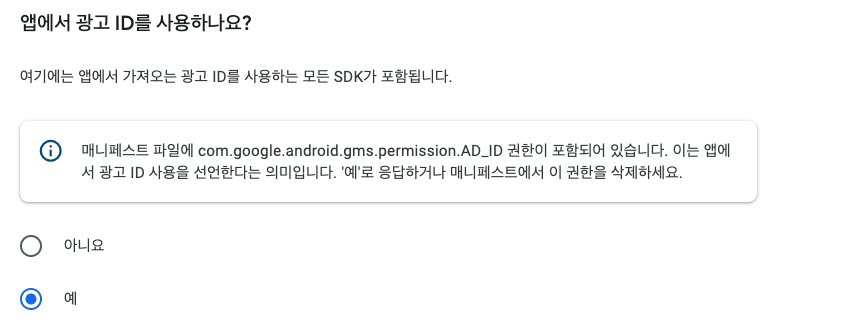 구글 배포를 하려고 aab 파일을 등록해놓고 보니 광고를 사용하지 않음에도 이러한 에러가 나왔다. 분명 우리 Manifest 파일에는 광고 권한을 기재하지 않았는데도 '예'로 응답하라고 한다!