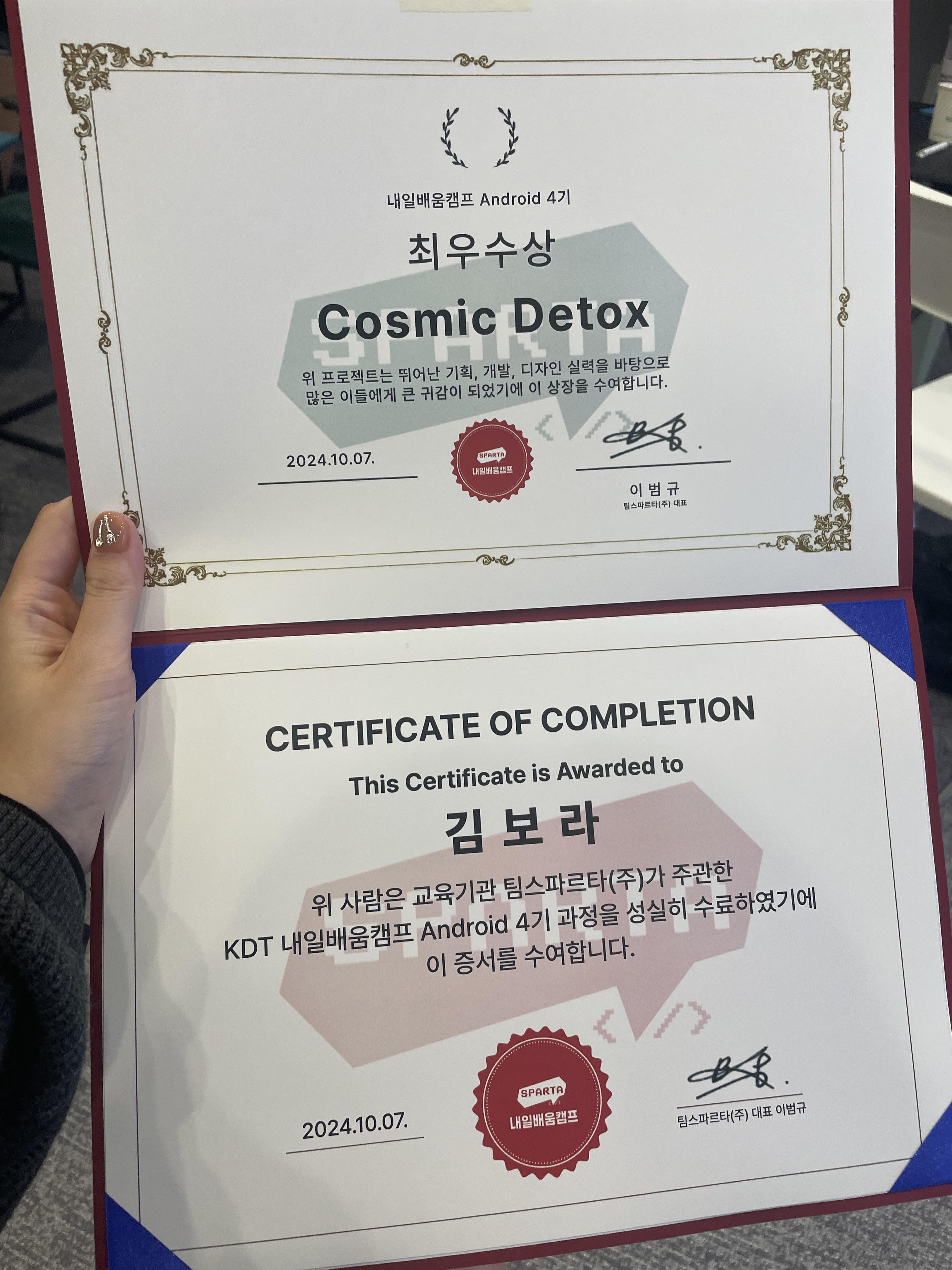최종 프로젝트 기간 때는 초반에 불만족했던 것이 유감스러울 정도로 내배캠에 만족했다. 게다가 정도 너무 많이 들어서 우리 팀원 아이들이 애틋할 정도! 나 같은 경우엔 최종 프로젝트를 처음 시작할 때부터 우수 사례를 보며 저렇게 우수 사례에 뽑힐 정도로 잘 해내야지, 라는 목표를 세웠고 그 결과 실제로 우리 팀이 최우수상을 수상하며 승리를 거머쥘 수 있었다. 당연히 나도 열심히 했지만 우리 팀원들도 그만큼 열심히 하고 다같이 약속을 잘 지켜줬기 때문에 최우수상까지 탄 것이다.