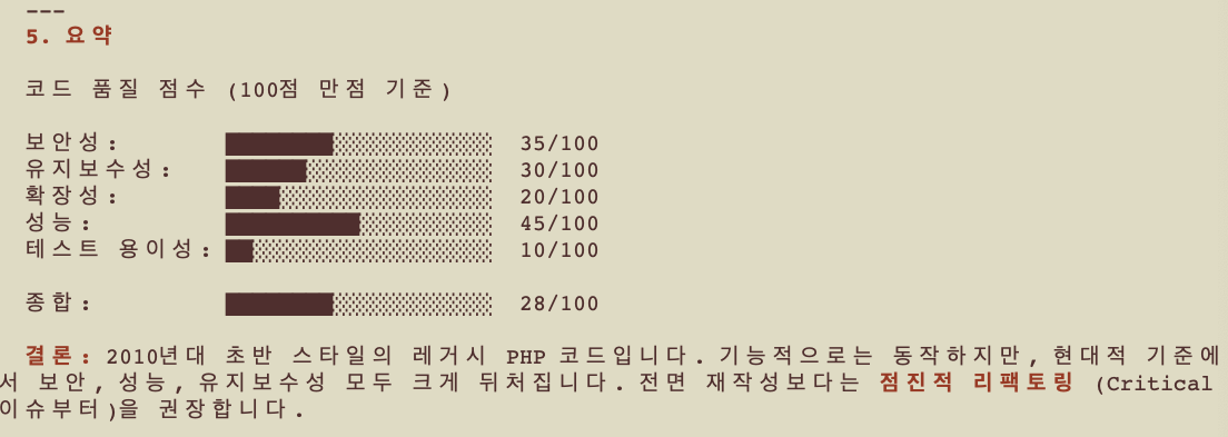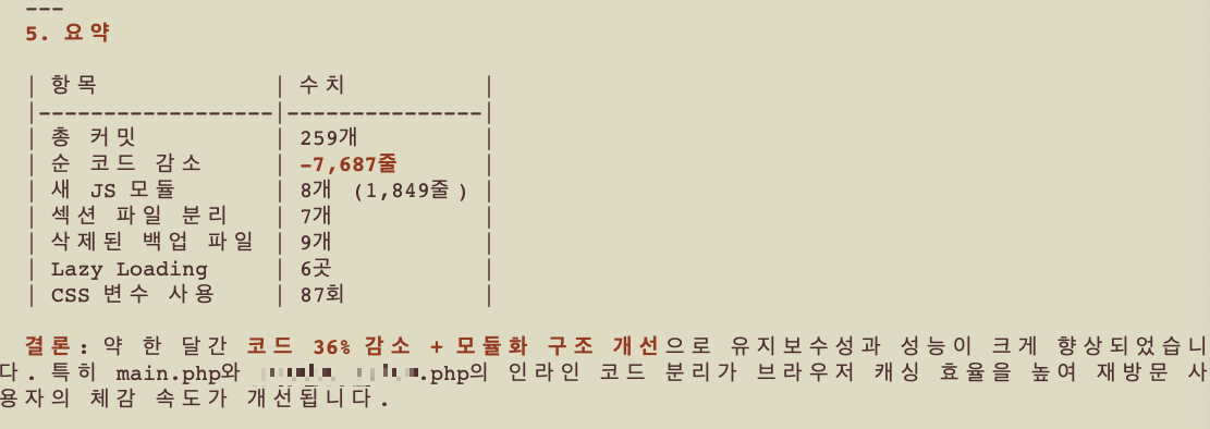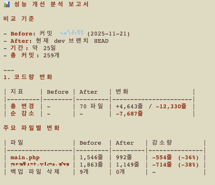 하지만 리팩토링 성과를 수치를 볼 수 있다. 3개월도 넘게 걸릴 작업을 AI와 함께 25일만에 끝냈다. (물론 아직 배포를 하지 않았기 때문에 앞으로 5일은 추가로 더 걸릴 것이다...^^;;) 클로드가 분석해낸 결과를 다시 한 번 살펴보자.