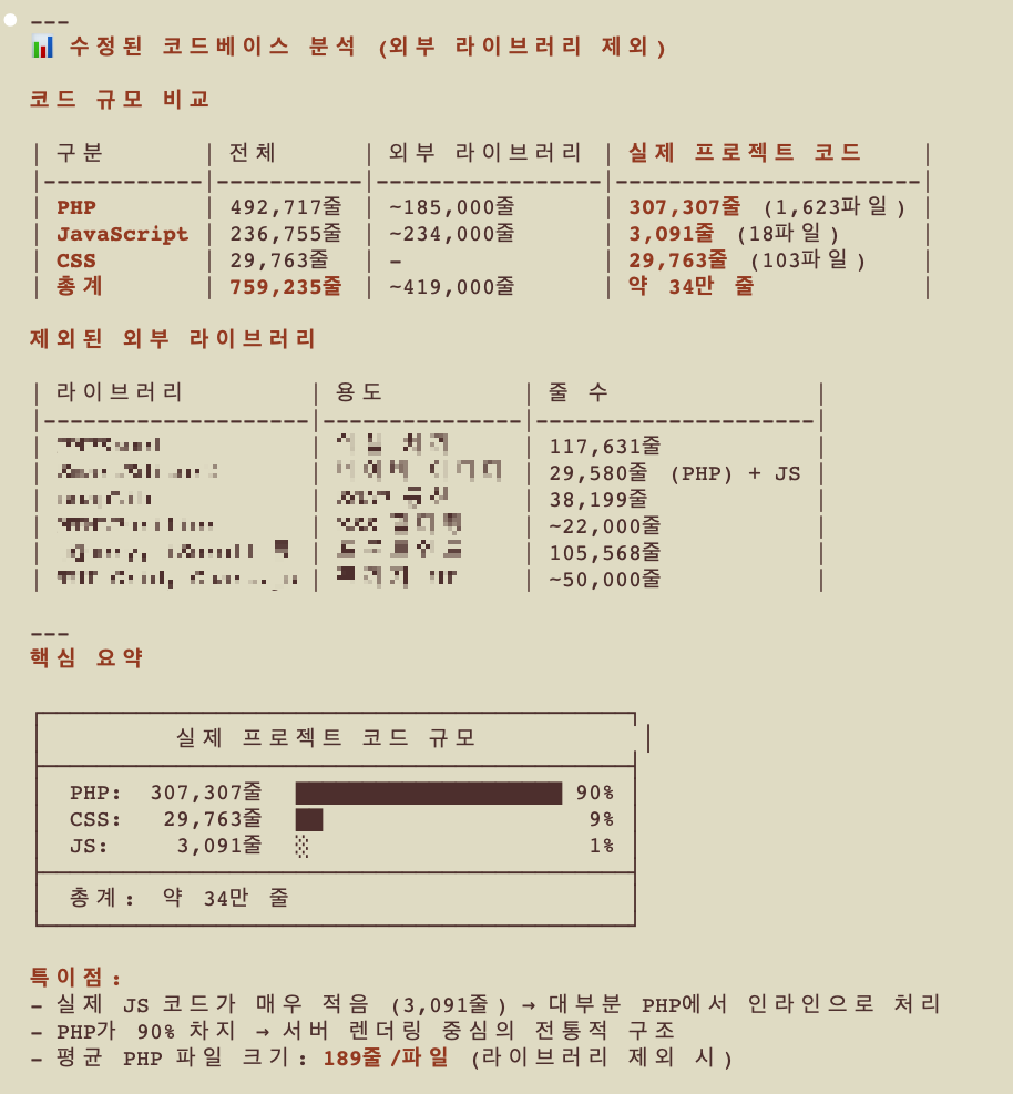 하지만 내가 지금 담당하고 있는 이 프로젝트는 완전히 말도 안 되는 스펙을 가지고 있다. 우선 Claude Code를 시켜 전체 소스 코드의 현황을 비교분석 시켜본 결과를 보여주겠다. (참고로 이미 개선이 끝난 코드를 분석한 것인데도 이런 결과다;)