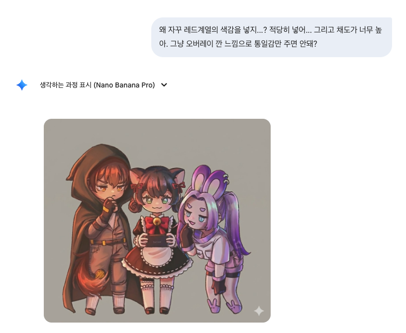 각자의 추구미 나의 취향을 조금씩 가미한 모두의 캐릭터다. 우선 그림 그린 것까지는 마음에 들었는데 늘 그렇듯 나는 명암단계가 정말 약하다. (앞으로 인게임 리소스를 그릴 때도 이게 가장 큰 고민이다 ㅜㅜ) 그래서 후보정을 제미나이에게 맡겨서 어떻게 하면 더 예쁘게 그릴 수 있을지 다양한 실험을 해보았다.