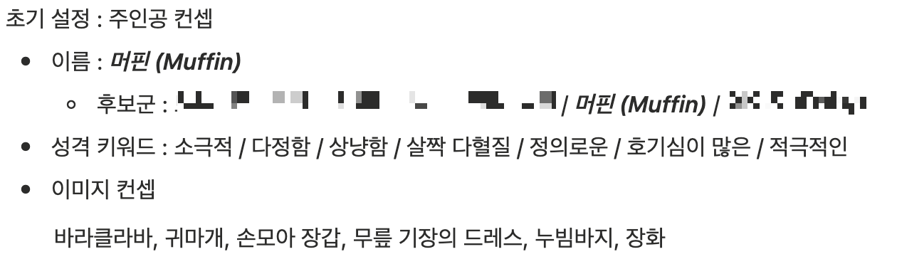 초기 주인공 컨셉은 이러한 느낌! "사랑받는 딸래미/손녀" 이미지를 주기 위해 정말로 할머니가 둘둘 싸매고 여행을 보냈으면 좋겠다, 는 일념으로 머핀을 겹겹이 옷으로 둘러쌌다. 그리고 머핀의 성격은 대략적으로만 잡아두고 유저가 직접 플레이 하며 성격을 구성해갔으면 좋겠다~ 는 느낌을 위해 키워드를 설정했었지만 이는 사실상 거의 폐기 되었다고 봐도 된다. 그저 귀여움 원툴이 되어버린 우리 머핀...